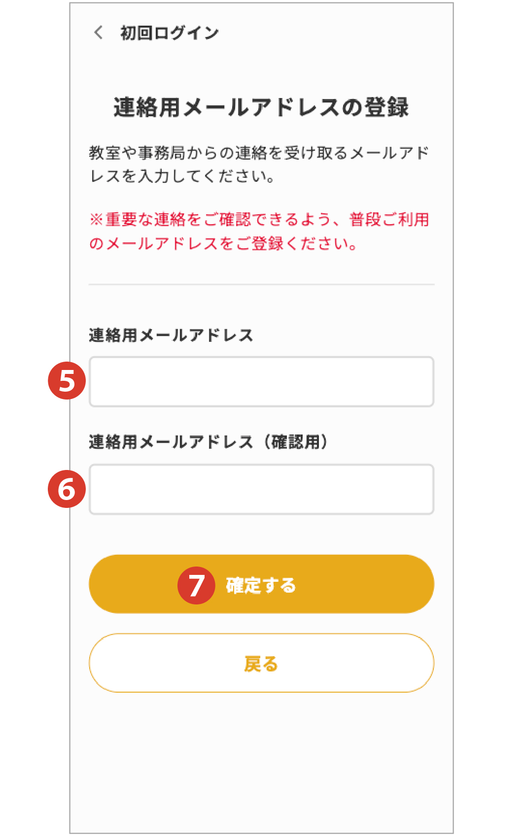 - ❻連絡用メールアドレス(確認用)を入力する。