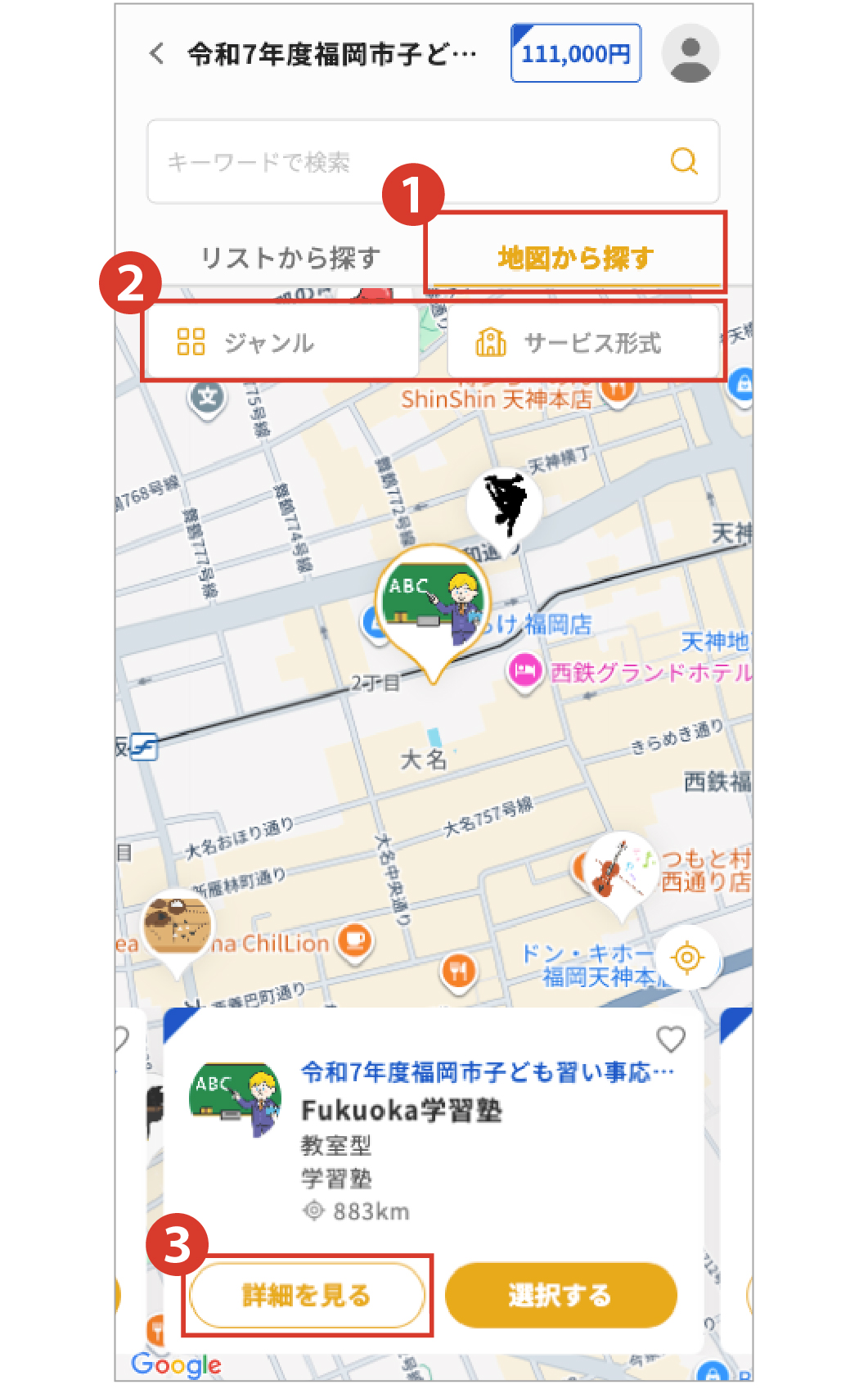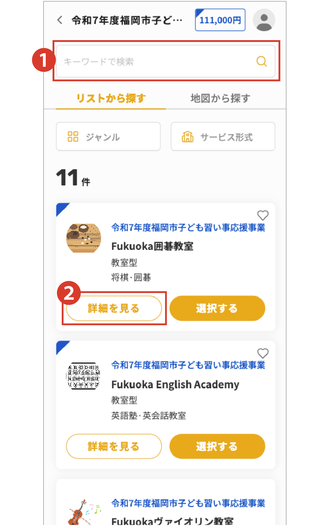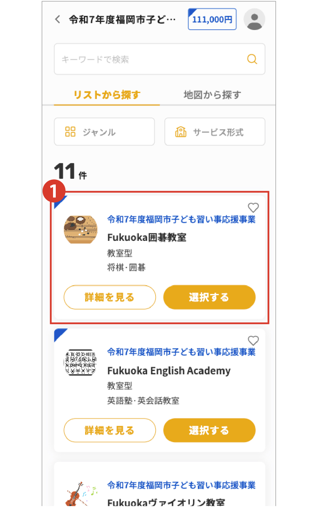 - ❶クーポンを利用したい教室を選び、「選択する」ボタンを押す。