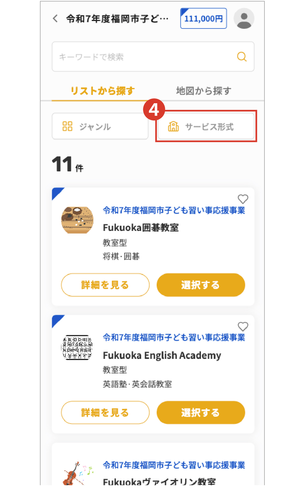 - ❺サービス形式を1つ選び、「この条件で絞り込む」ボタンを押す。
