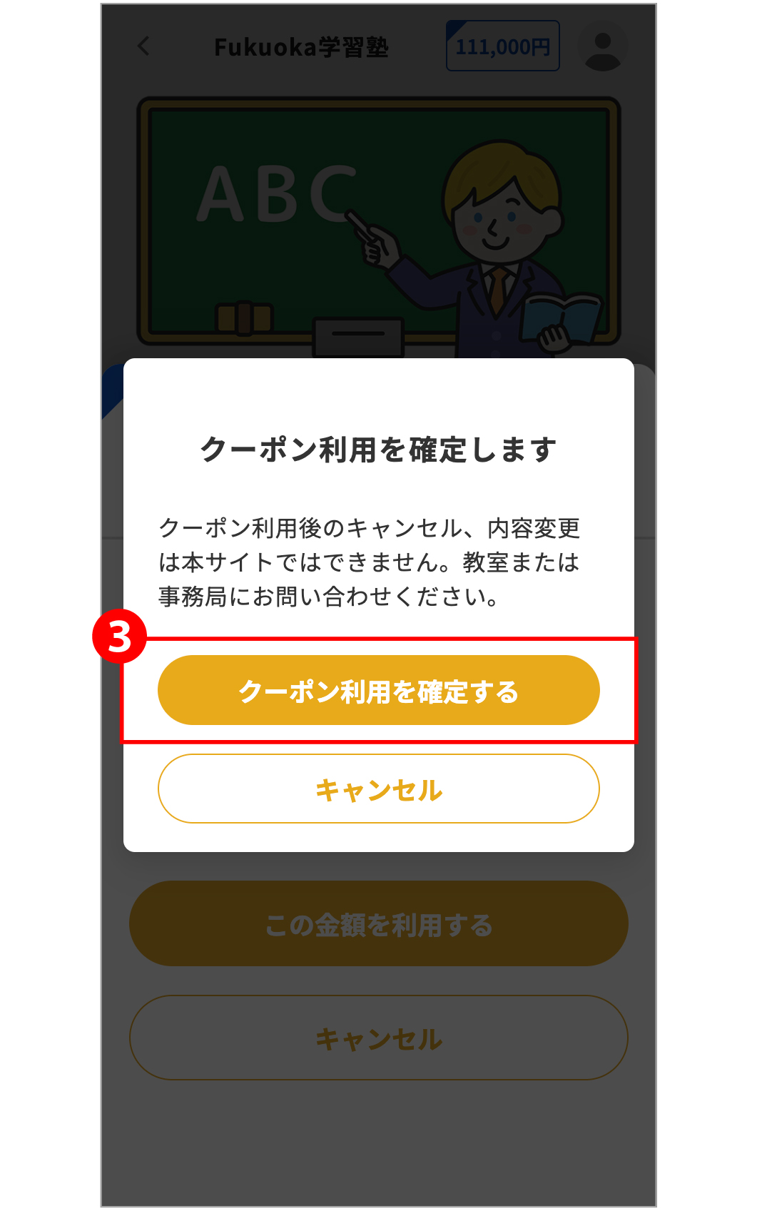 - ❸「クーポン利用を確定する」ボタンを押す。